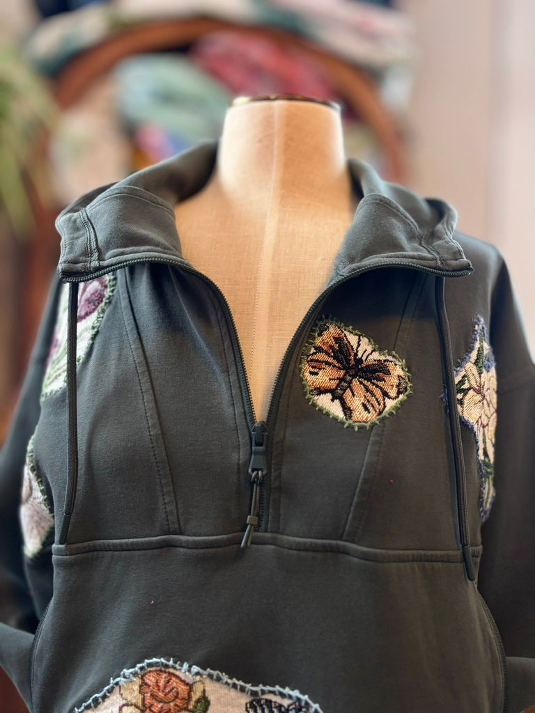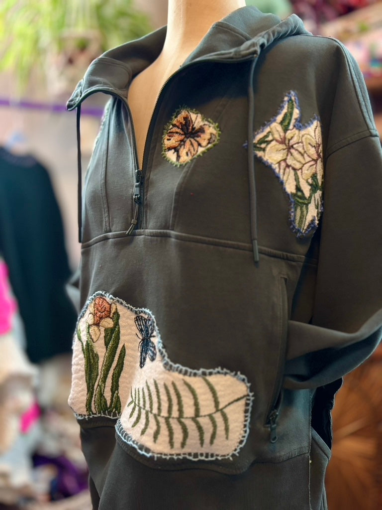 Soft devotion in wearable form. The Green Girl Era Lounge Set is made from silky-soft fleece base pieces and finished with vintage floral table runner patchwork and embroidered detailing — cozy, drapey, and effortlessly romantic. Deeply crush-coded. Designed for lounging, yearning, and being admired in comfort.