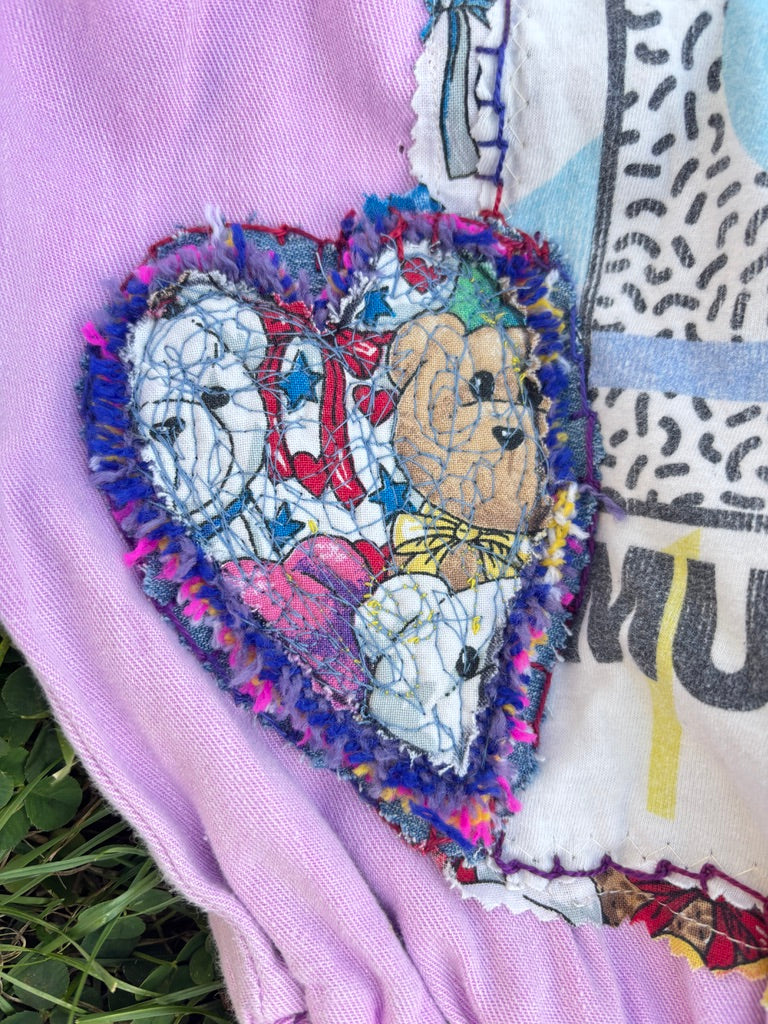Style: Orchid-colored, stitched with vintage MTV graphics + Beanie Baby heart accents