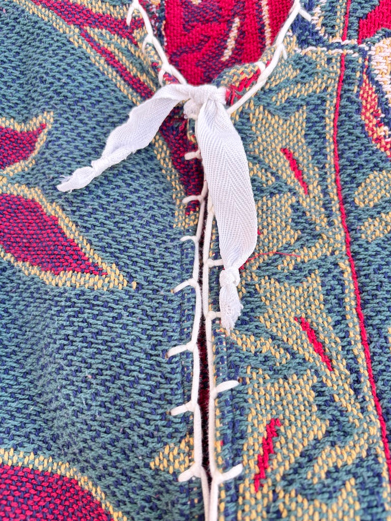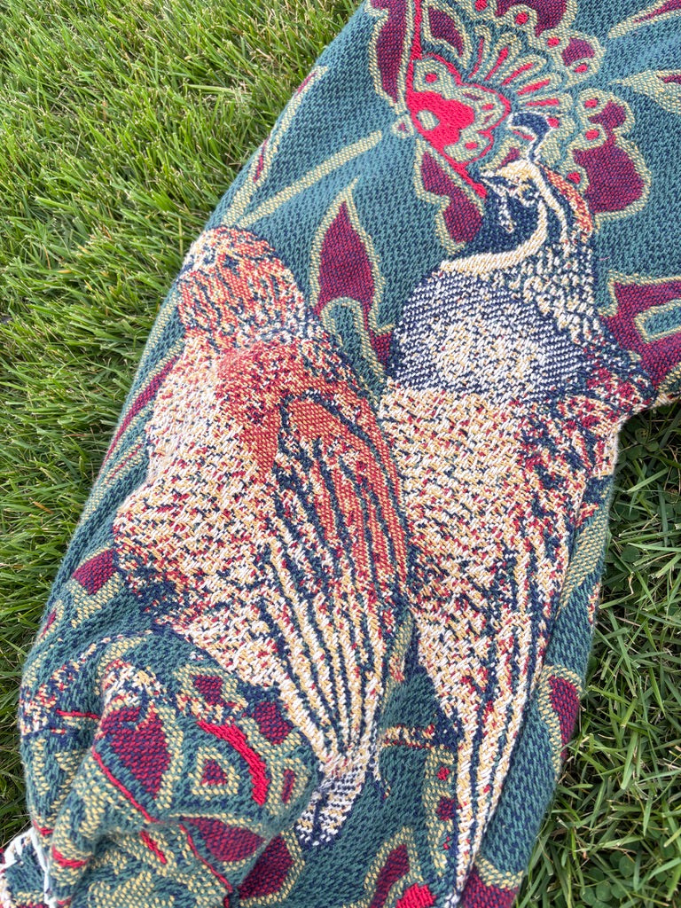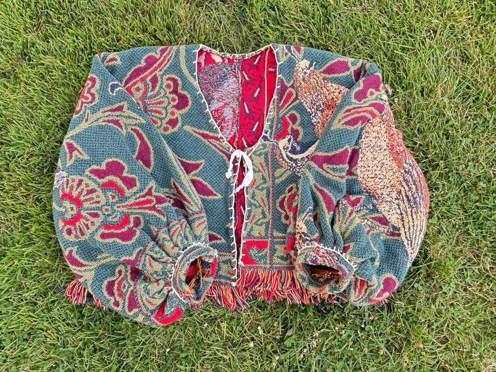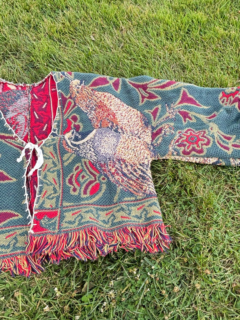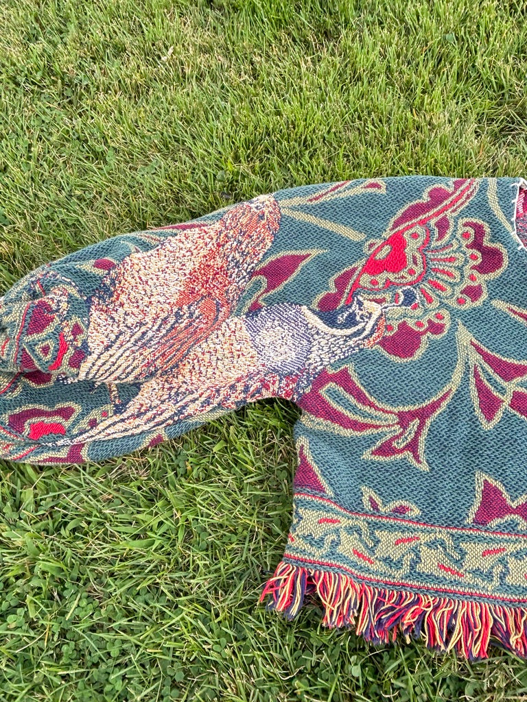 Style: Jewel-toned vintage blanket cardigan with bird motifs